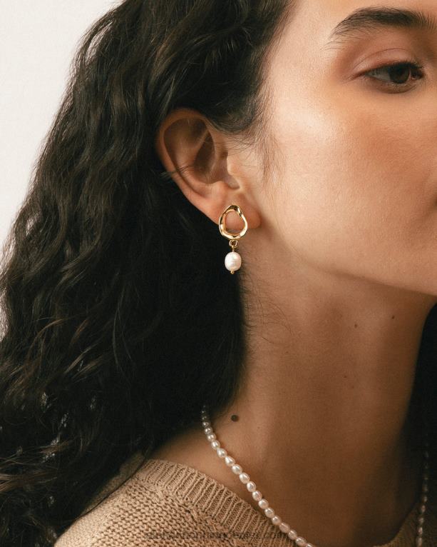 izkoriščajo lepoto biserov, da poudarijo vaš najboljši sijaj – to so kakavovi uhani. ta viseči duo ni kot noben drug – nepravilni valovi opredeljujejo kiparsko silhueto zlatih čepov, medtem ko nihajoče kroglice visijo na kratkem padcu. dajte jim čas, da zasijejo skupaj z našo preprosto ogrlico, ki se ujema.