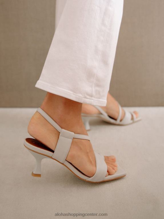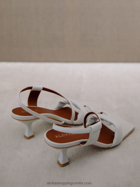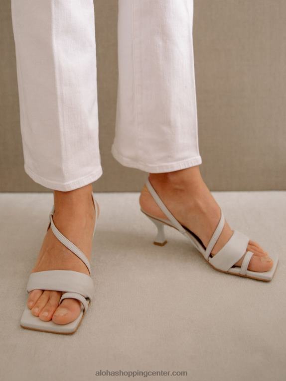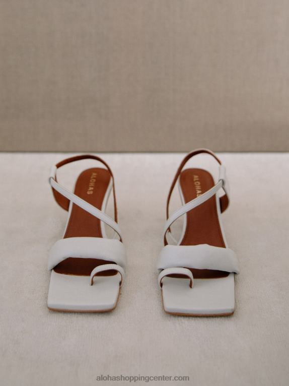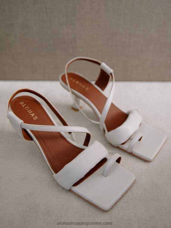 Beli usnjeni sandali z asimetričnimi paščki in mačjo peto