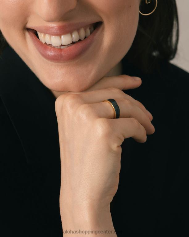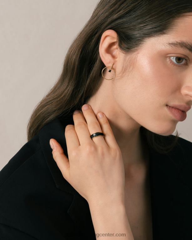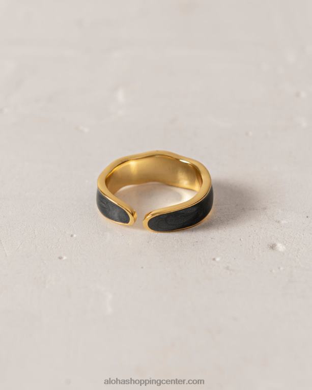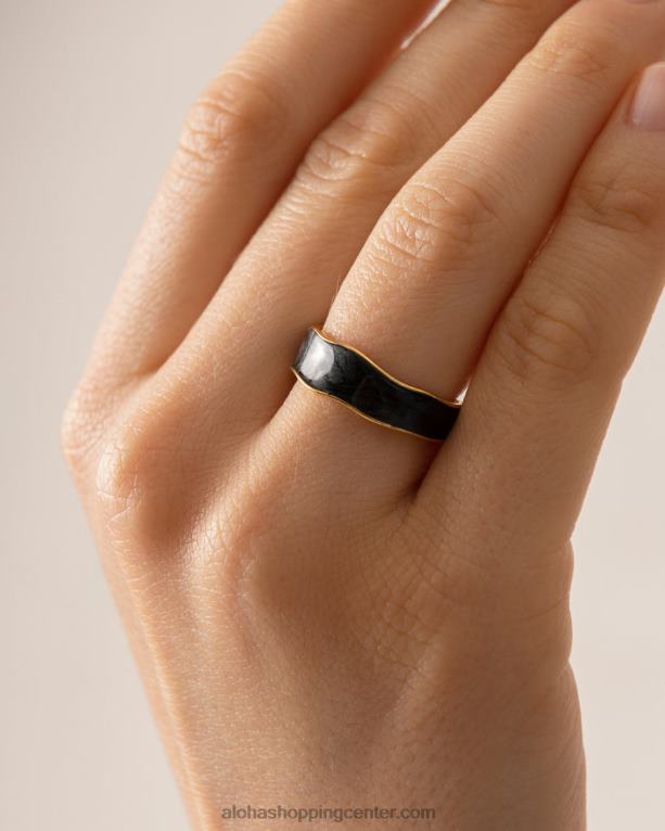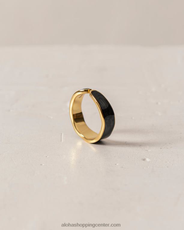 trajnostni nakit na dosegu roke! izdelan iz pozlačenega srebra št. 900 št., tram ima valovite robove in kontrastno črno lakirano intarzijo. naj bo lep in preprost ali pa ga zložite s kupom tanjših prstanov za značilen maksimalističen videz.