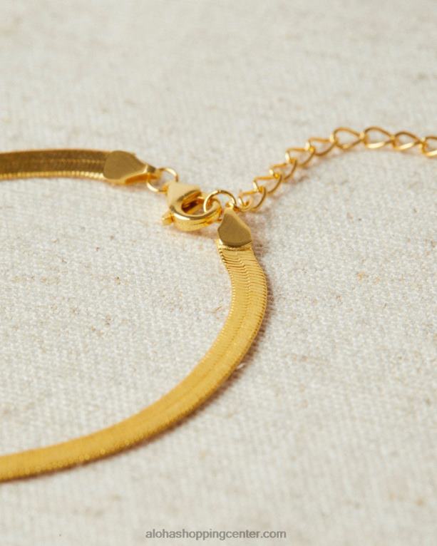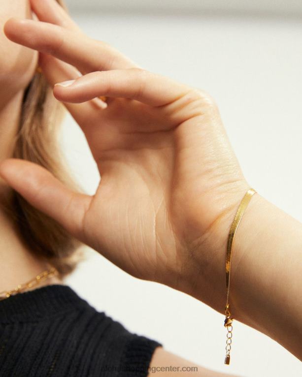 Ta zlata zapestnica, drzna v svojem minimalističnem dizajnu, je popolna sladica za roko, ko je cilj videti eleganten. izdelan je po vzoru klasične verižice v obliki ribje kosti, tako da sedi ravno na zapestju. premišljeno oblikovan kos, ki ne zahteva stilskih veščin – vključite ga v vsako obleko z minimalnim trudom, a največjim učinkom.